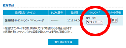 「マイページ」の登録製品に購入したダウンロード製品が登録されているので〔ダウンロード〕ボタンを1回クリックします。